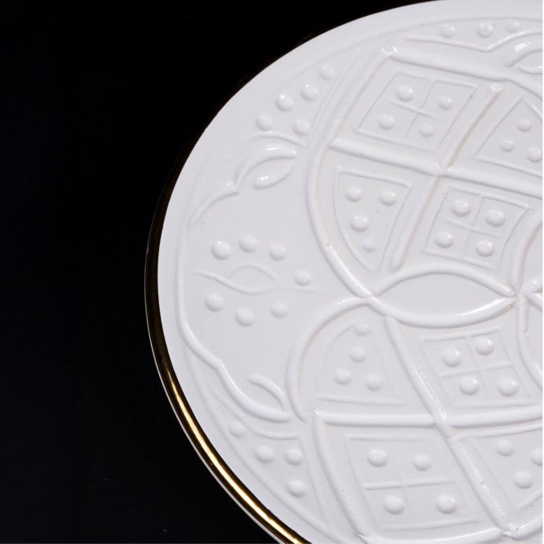 Design : Elle est caractérisée par un liseré doré sur le bord et des motifs en relief (gaufrés) sur la surface, comme on le voit sur les images de produits similaires.