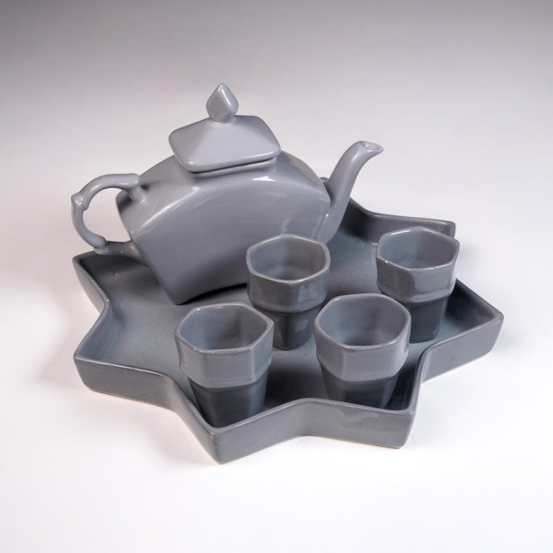 Service à thé marocain en forme d’étoile de haute qualité, fait d’argile et de céramique, avec des couleurs naturelles berbères et un design géométrique.