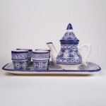 La théière, aux couleurs vives et aux motifs géométriques, reflète l’art ancestral de la poterie marocaine. Les verres, quant à eux, sont parfaitement coordonnés avec la théière, offrant une harmonie visuelle et fonctionnelle. Le plateau avec son design central ajoute une touche élégante et décorative à ce coffret.