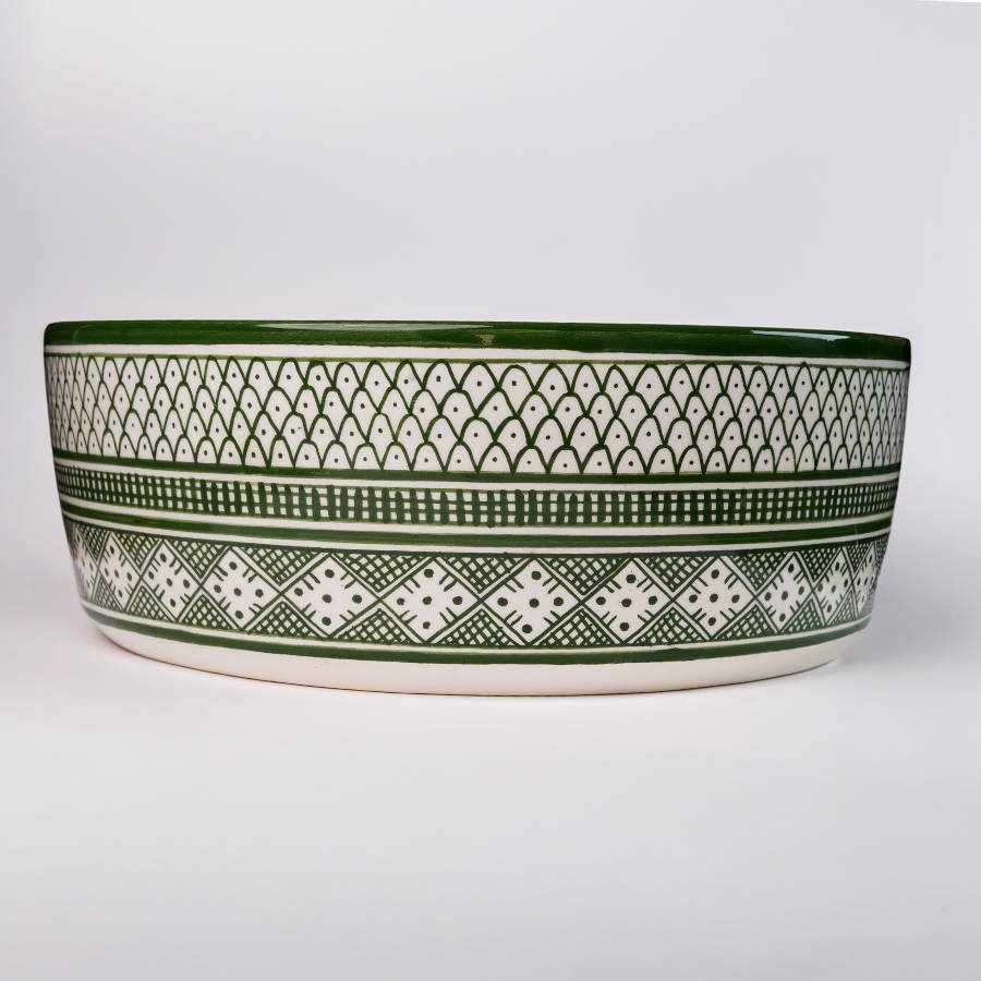 Inspirée par l’élégance et le luxe de Fès, berceau de l’artisanat marocain, cette vasque en céramique allie authenticité et modernité. Ses motifs vert roi, soigneusement peints à la main, mettent en valeur le riche patrimoine des artisans de Fès.